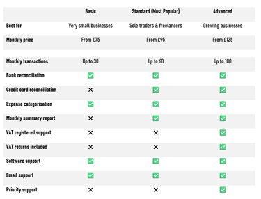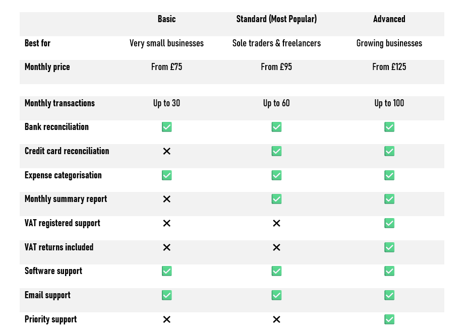 Prices are based on average monthly transaction volumes and the level of support required. If your business grows, becomes VAT registered, or requires additional work, your package and pricing may be reviewed.