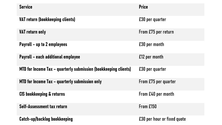 * MTD for Income Tax submissions require digital records to be maintained in line with HMRC requirements. Pricing depends on record quality and whether bookkeeping support is included.